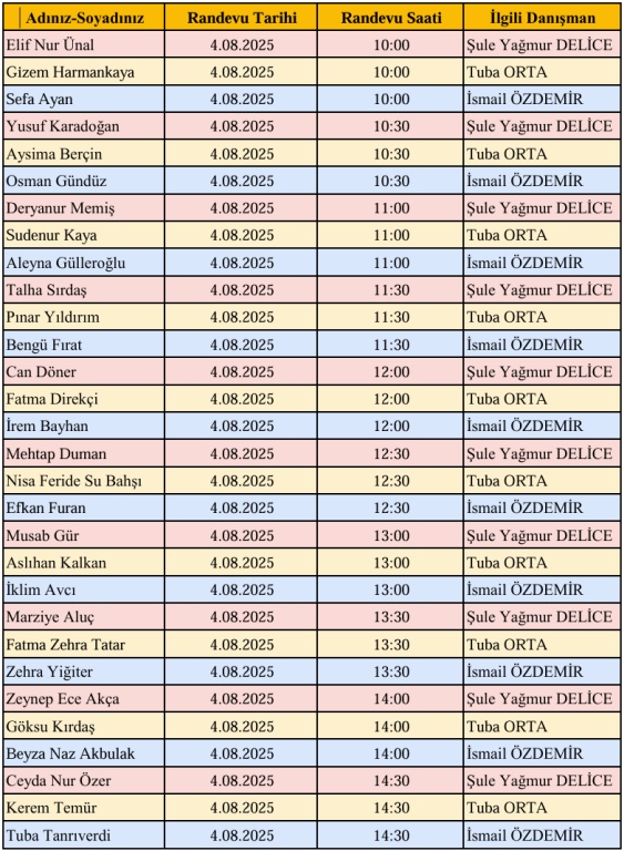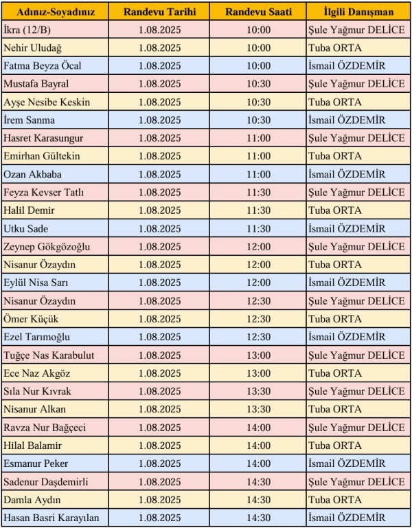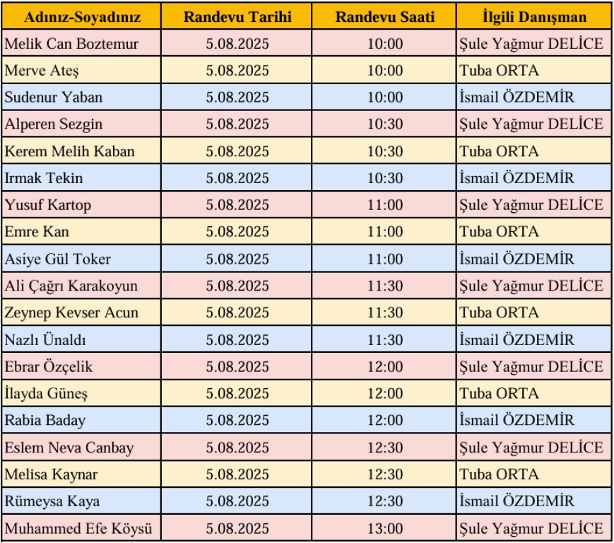 - Tercih danışmanlığı hizmetinin daha etkin ve daha verimli yürütülebilmesi için siz değerli mezun öğrencilerimizden durumunuzla ilgili veri toplandı ve bu verilere dayanarak tercih danışmanlığı hizmetinden yararlanmak isteyen öğrencilerimiz için randevu planlandı. Şahsınıza ait randevuya aşağıdaki listelerden bakabilirsiniz.